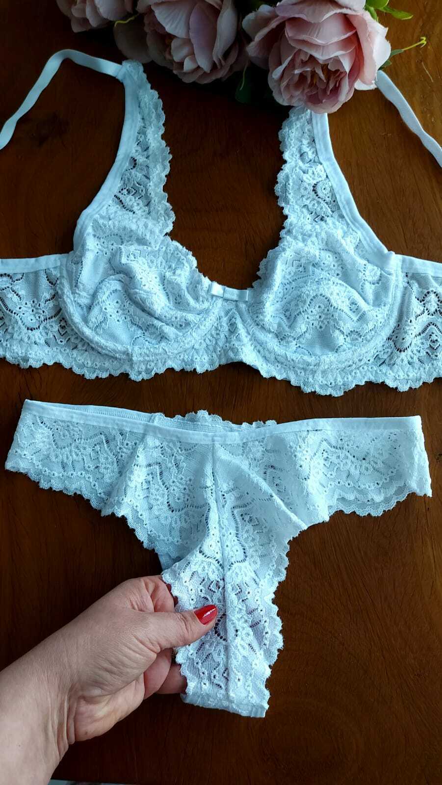 Nosso conjunto Olívia é feito com renda laise, uma renda maravilhosa e que traz muita sofisticação à peça. Possui sutião sem bojo com aro, todo forrado nos seios. Calcinha toda na mesma renda com a parte de trás fio duplo toda em renda.