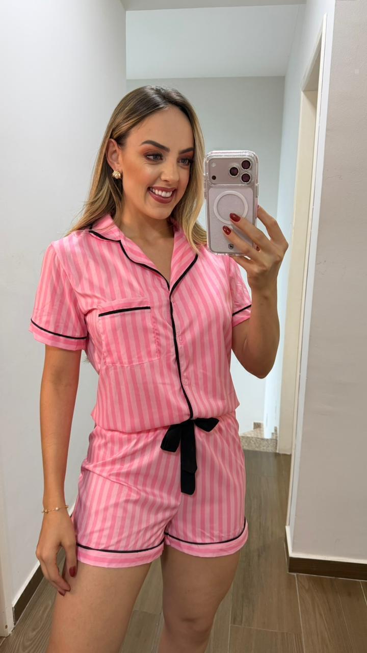 O pijama short doll americano de manga curta é confeccionado em um tecido leve, fresquinho e sofisticado que é a sedinha que tem um toque maravilhoso, super macio e aconchegante. Possui gola com lapela, fechamento por abotoamento frontal, bolsinho na blusa e detalhe em viés, com contrastes que dão charme e elegância à peça.