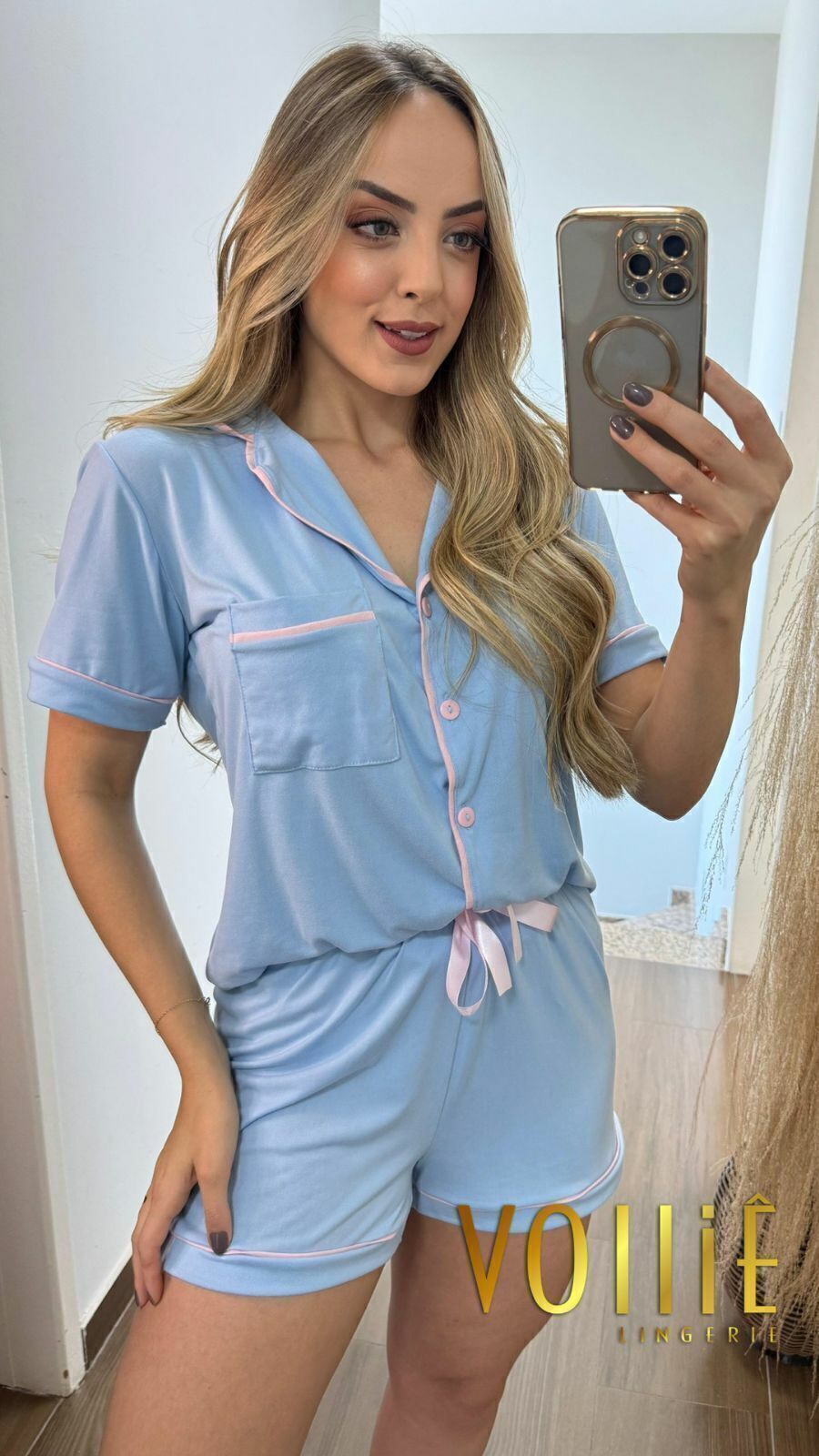 O pijama americano de short e blusa de curta longa é confeccionado em um tecido leve e muito fresquinho, o que proporciona uma sensação de maciez e leveza quando vestido. Possui gola com lapela, fechamento por abotoamento frontal, bolsinho na blusa e detalhe em viés, com contrastes que dão charme e elegância à peça.