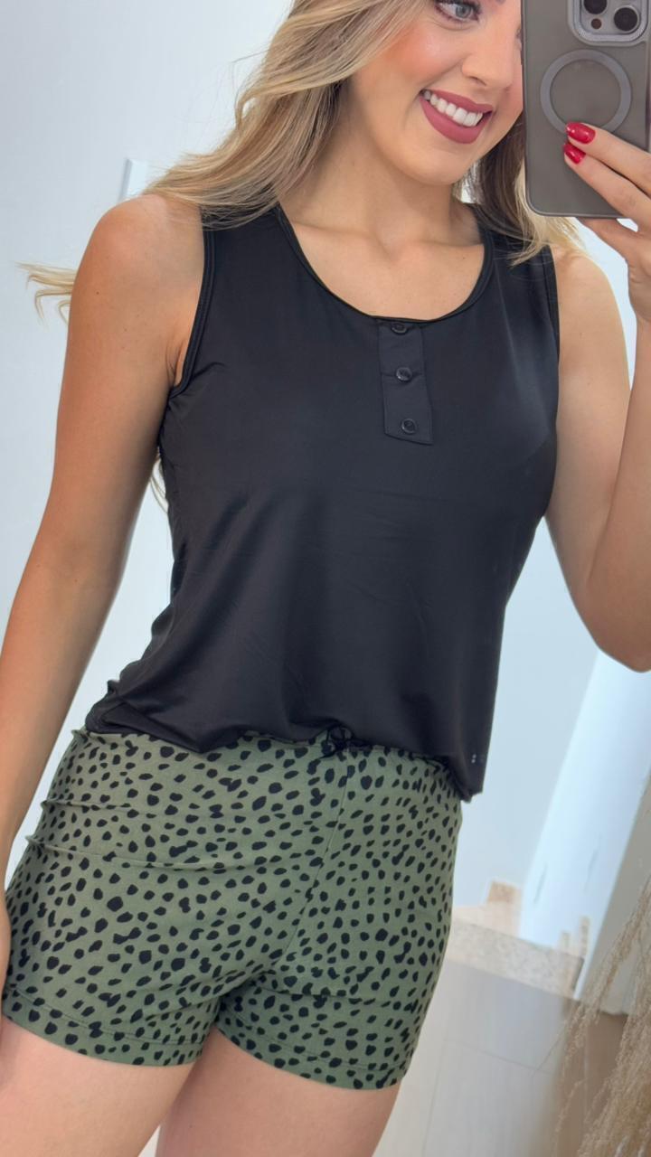 Pijama de short e camiseta de alças largas com detalhe com três botões.