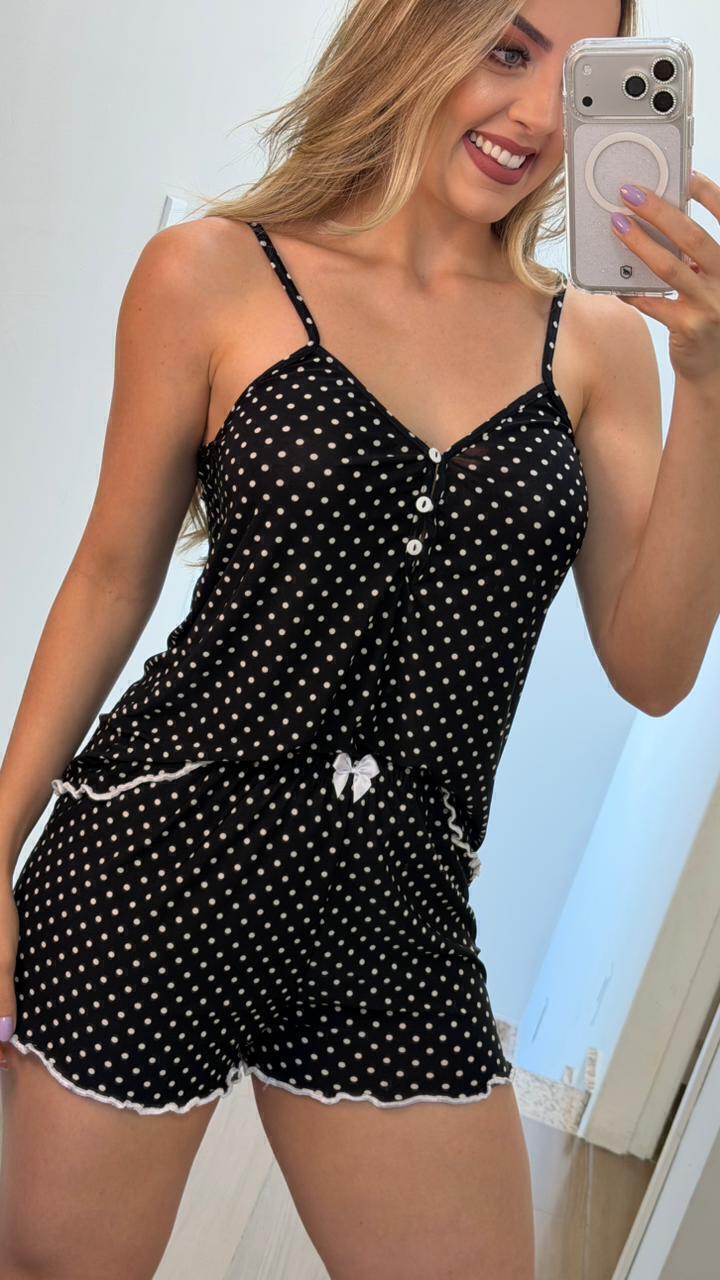 Pijama de short e blusa de alcinha com detalhes entre os seios com três botões e rendinha.